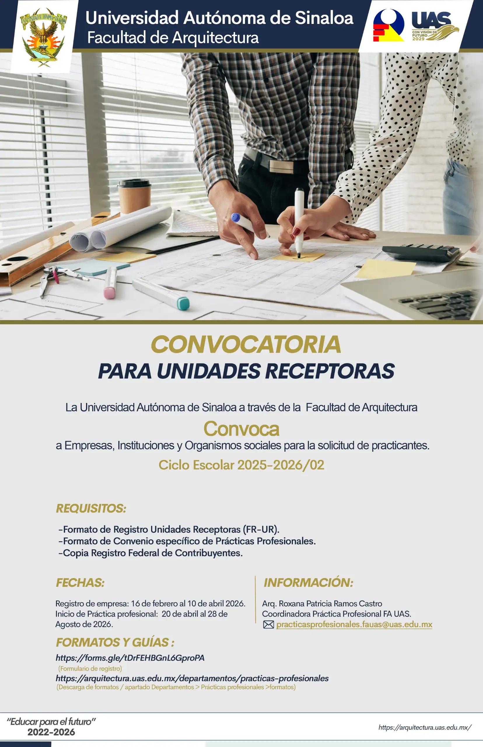Las Prácticas Profesionales (FAUAS) son actividades inherentes a la formación en Arquitectura. Su finalidad es la aplicación de conocimiento y la vinculación con el entorno social y productivo. Esto permite al alumno coadyuvar en la solución de problemas de la vida profesional.